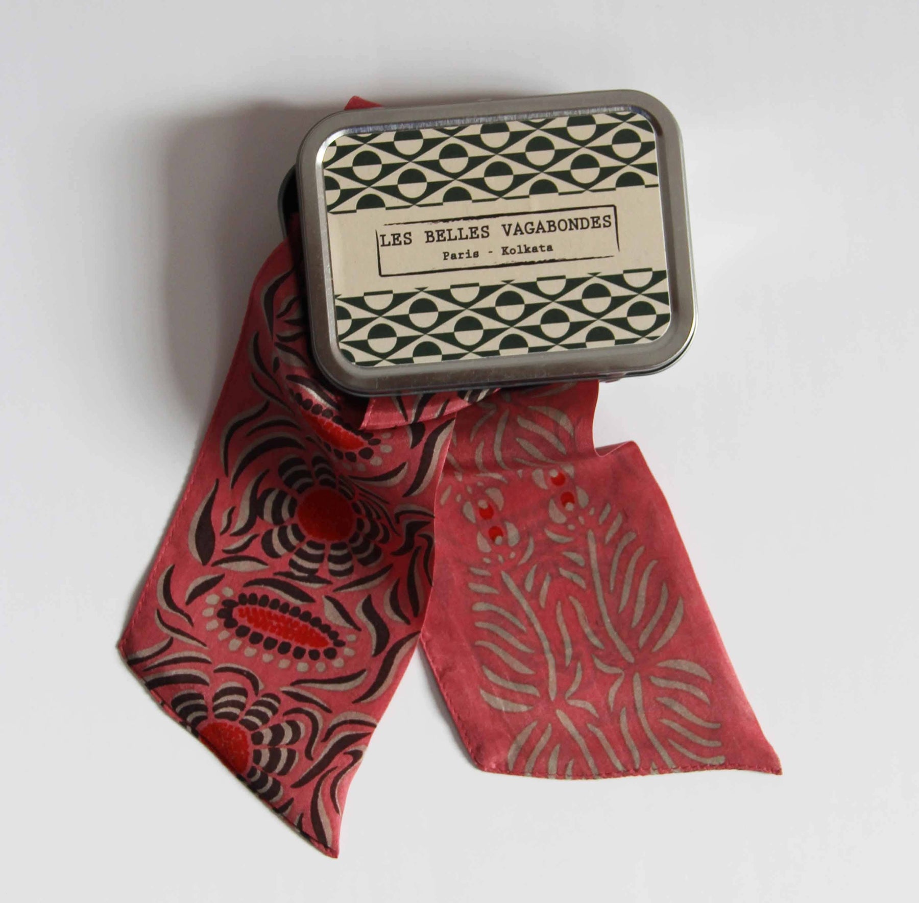 The SLASH Headbands Our headbands are made of silk, they are an essential fashion accessory to complete your outfits with a touch of color and originality. They can be worn as a bun or a headband/as a lavallier/as a belt/around the neck/around the wrist/on a hat/on a bag... Sold in an iron box with a clean and reusable design, Slash headbands make an unusual gift. 100% silk 8 x 150 cm Hand drawn in France Hand printed in India