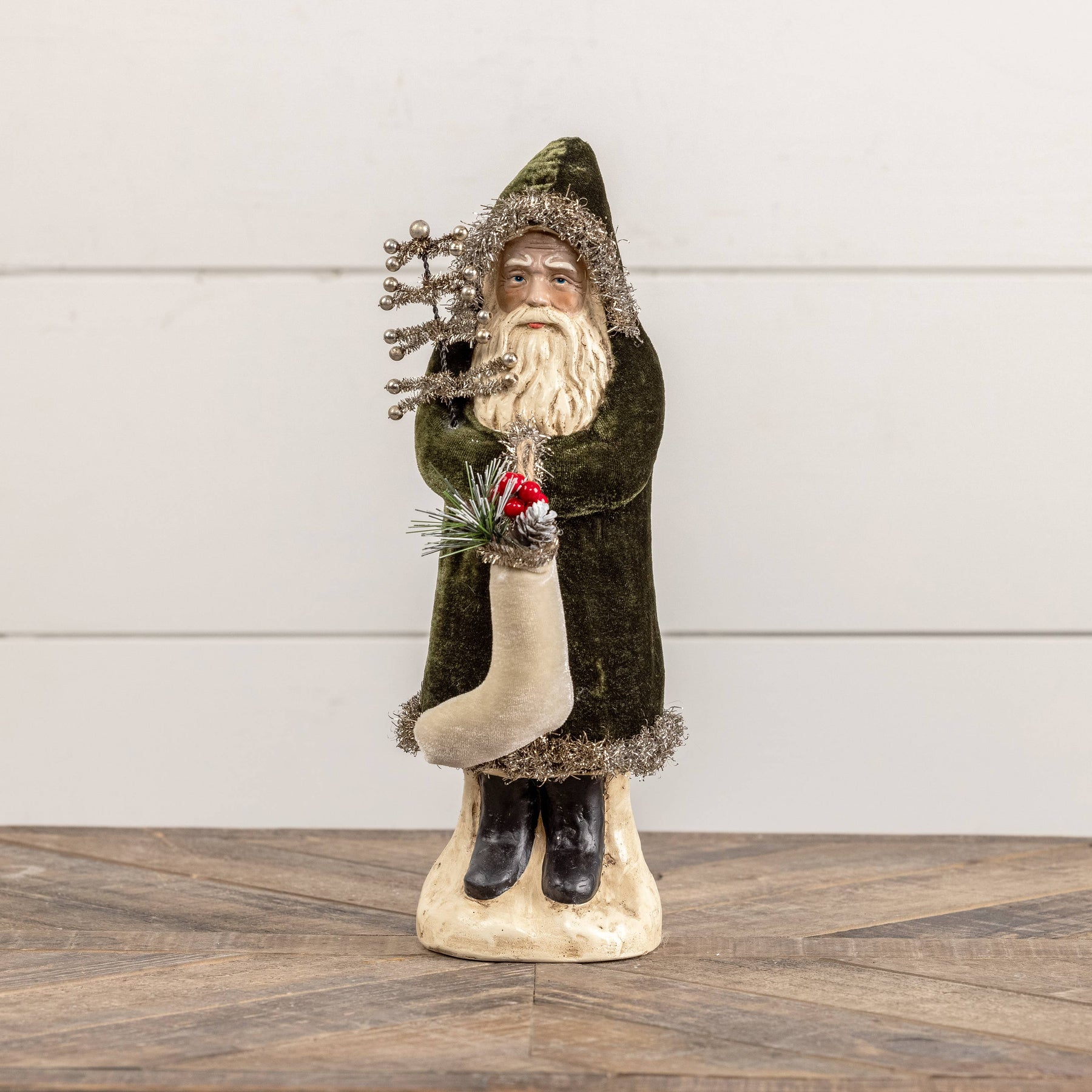 We bring you our 12" Forest Velvet Belsnickle. This decorative figurine, with its lush velvet texture, adds a touch of winter magic to your Christmas decor. Its rich green color makes it a charming addition to your festive adornments. Crafted with our commitment to quality, this piece is designed to be a heirloom, becoming a  part of your holiday traditions for years to come. Add WHIMSICAL magic to Christmas