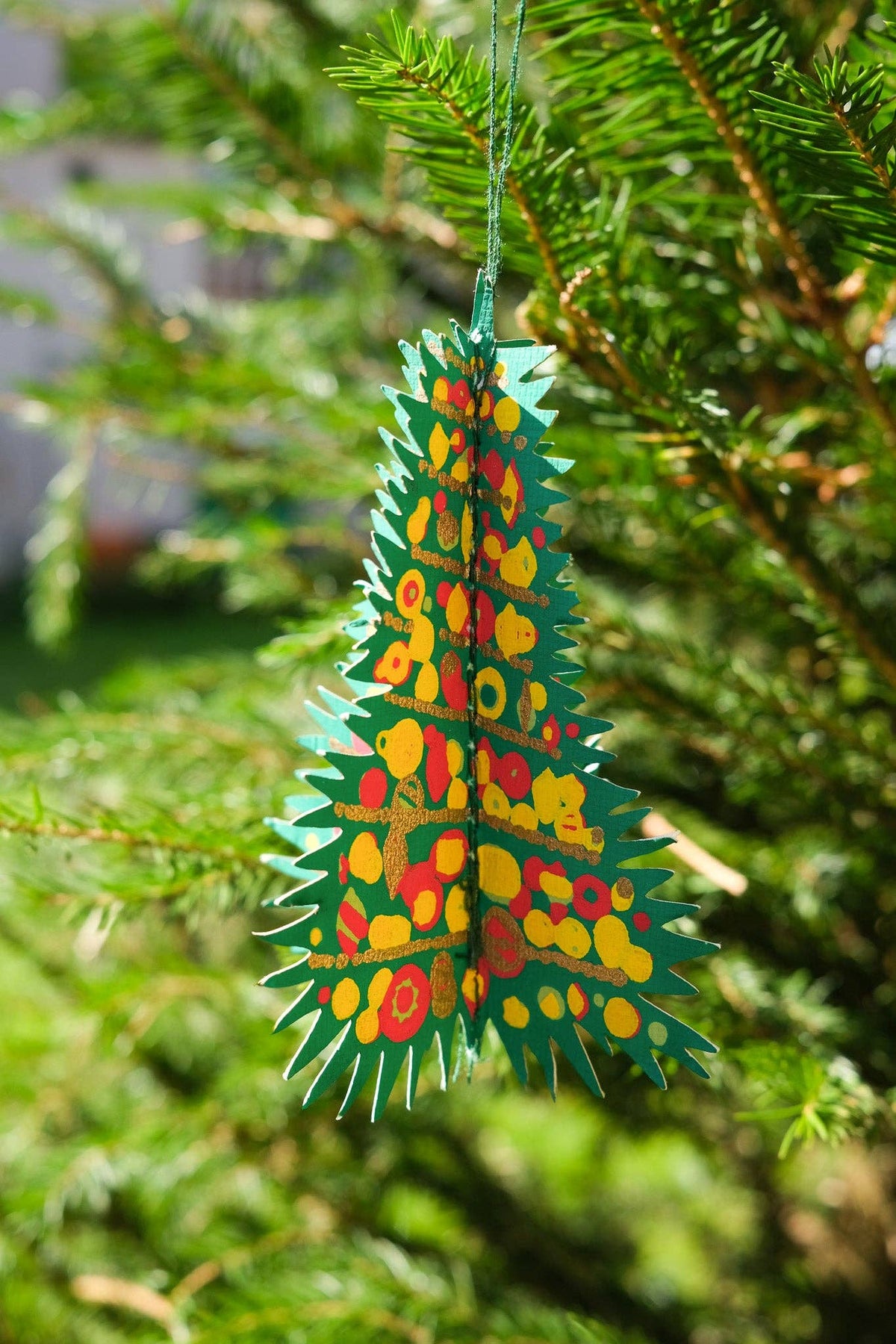 Four fold out decorated paper Christmas trees. Each has a hanging cotton loop, and is ready to decorate your home.