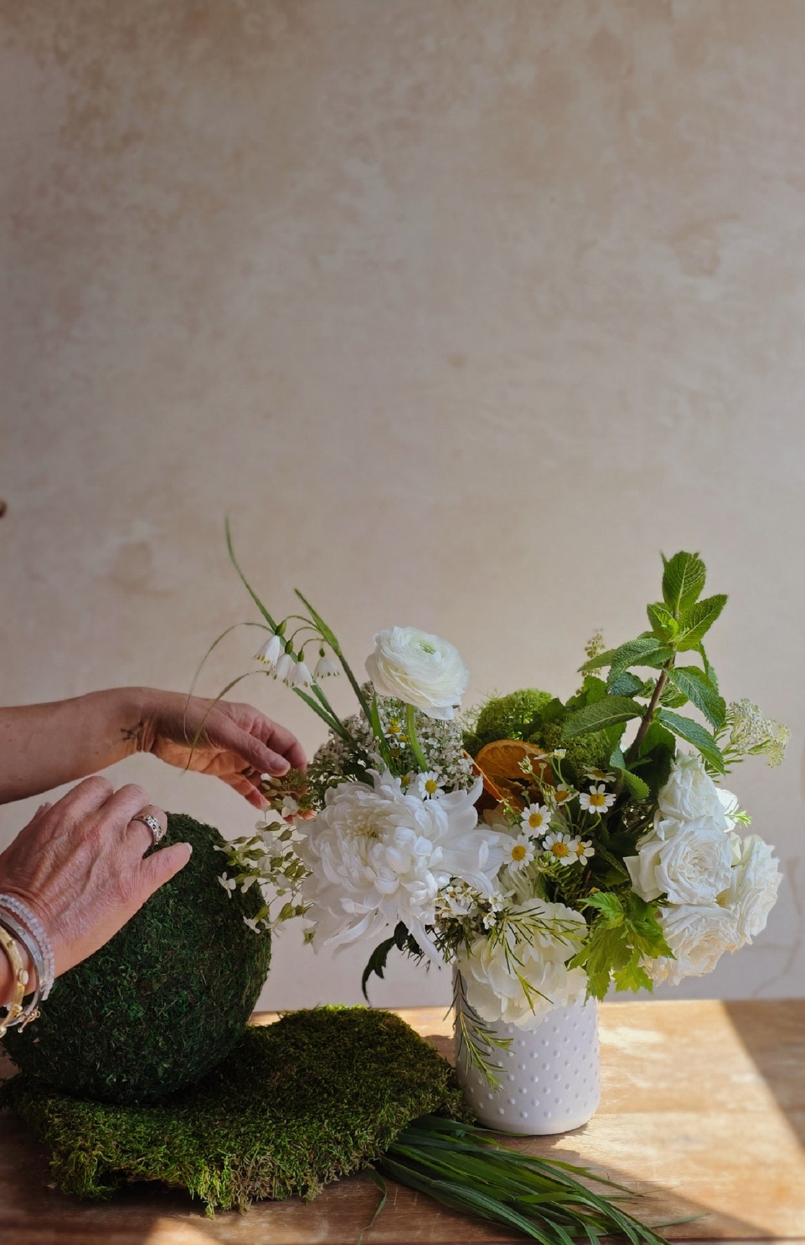 A gentle arrangement of florals and greens in milk glass. Creamy, softened, and romantic, like light resting on linen and the end of the day. Roses, hydrangeas, tutu chrysanthemums, moss, citrus, & herbs.