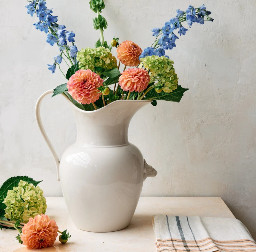 Commanding and majestic, this massive stoneware pitcher is a statement piece fit for a grand Italian hall. A sweeping handle and robust body define its silhouette, while a clever sculpted lion head provides a secondary support grip evoking courage, excellence, and a welcome touch of classic Italian beauty.