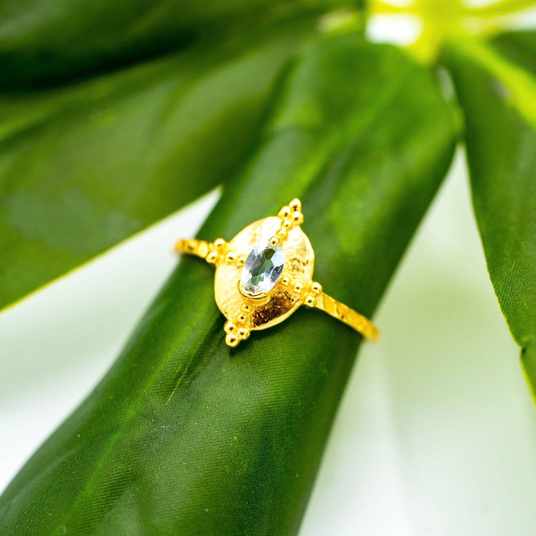 Royal ring featuring faceted blue topaz in gold plated brass.