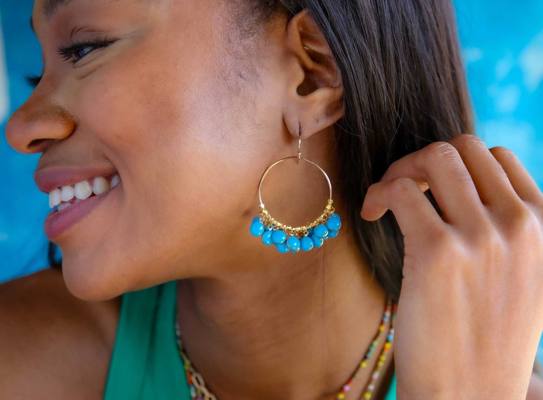 In the Karaoke Earring, vibrant enamel drops dance along a golden hoop. Layered and fluid, they create a lively, percussive shimmer! Our earrings are truly a celebration of individuality, and for those who value thoughtful details and enjoy feeling put together for any outing, from lunch, to the nail salon, to carline and everything in between.