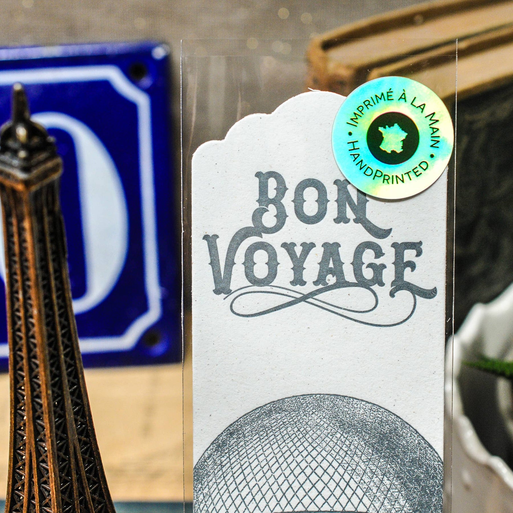 Beautiful bookmark created from a vintage engraving of a hot balloon, with « Bon Voyage » written on top of it. Hand printed with Letterpress on semi-thick recycled paper, and can be paired with other items from the same collection. A holographic sticker highlights that this bookmark is printed by hand in France.